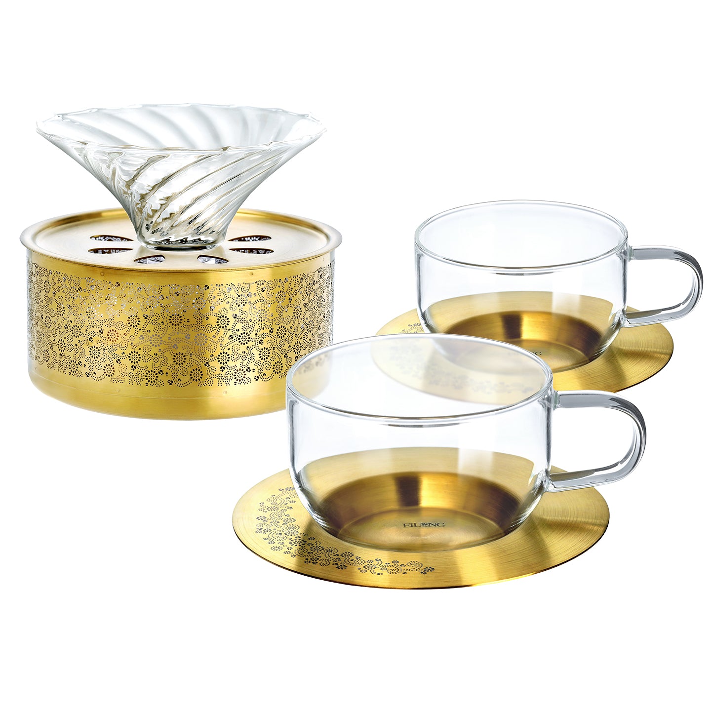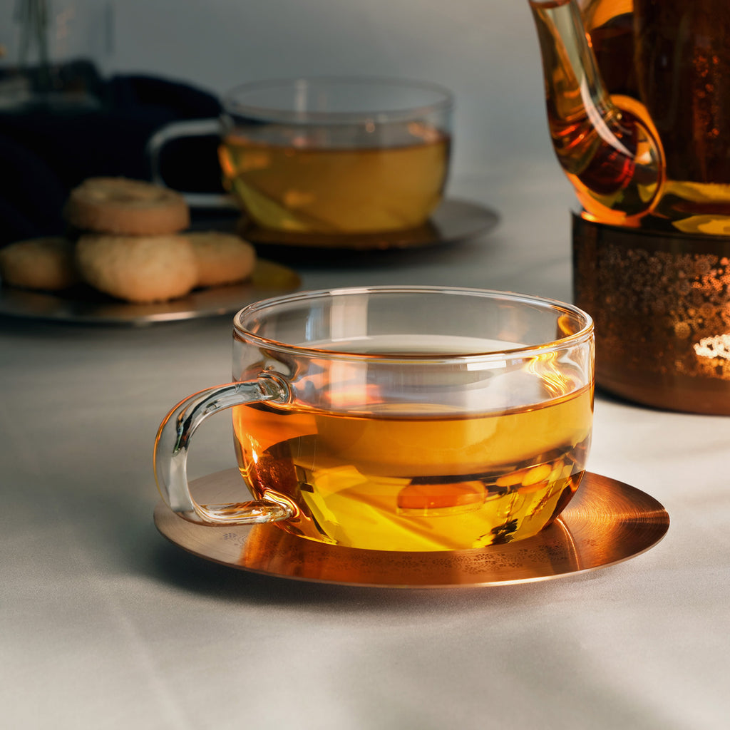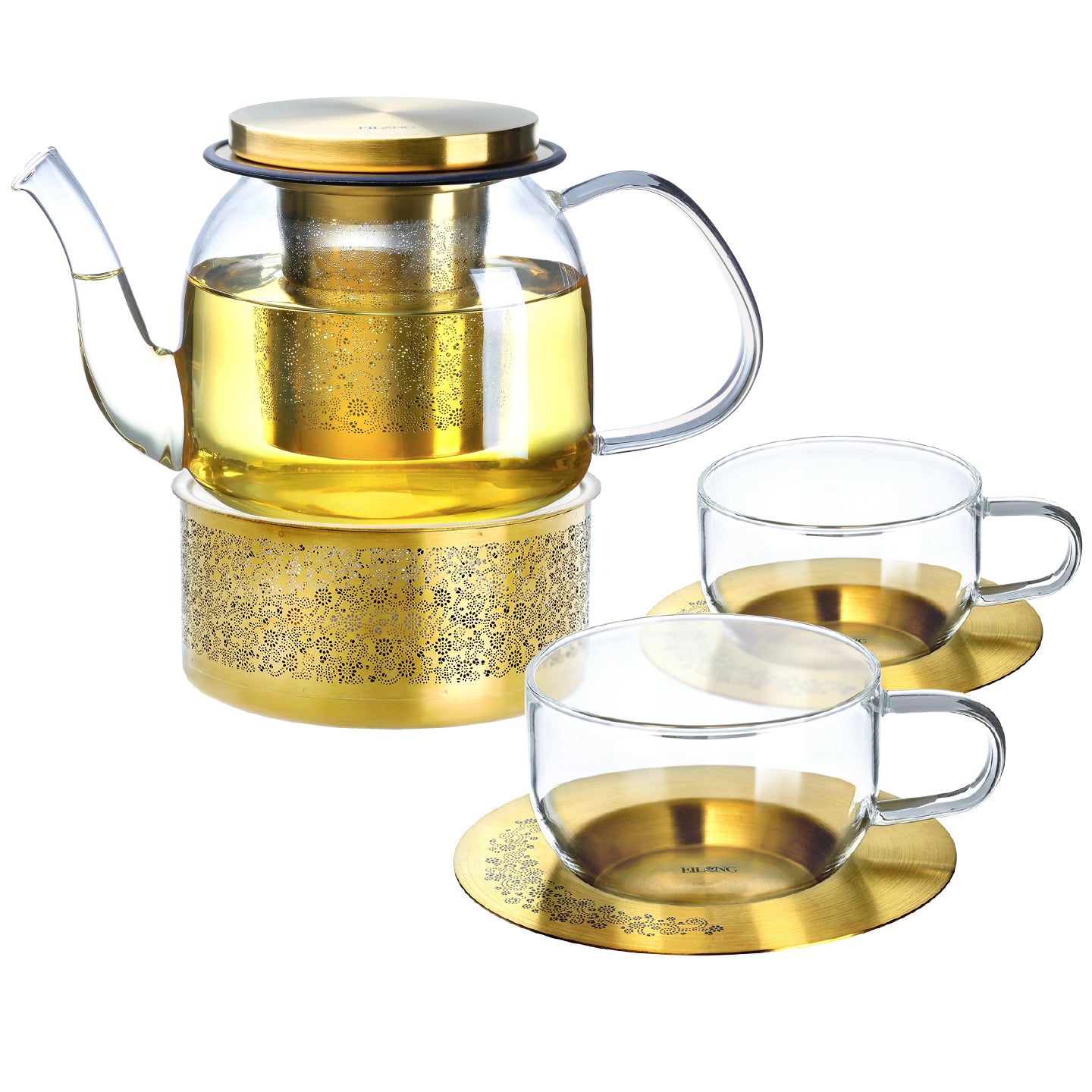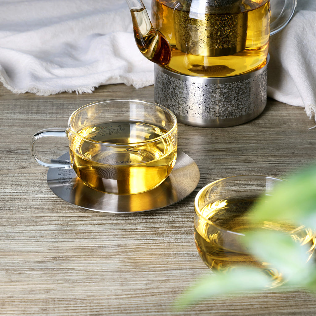 - 1 Warmer, 1 Glass Teapot, 2 Glass Cups & 2 Saucers.